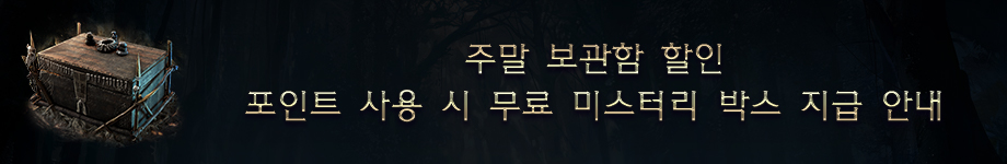포인트 사용 시 사냥의 서막 미스터리 박스 무료 지급할인 기간 동안 상점에서 포인트를 사용하시는 경우, 사냥의 서막 미스터리 박스 1개를 무료로 제공해 드립니다.할인 중인 보관함 탭들이나, 그 외에 포인트 아이템 중 어떤 것을 구매하셔도 '사냥의 서막 미스터리 박스'를 선물로 받으실 수 있습니다. 사냥의 서막 미스터리 박스에서 획득 가능한 모든 외형 변경 아이템은 패스 오브 엑자일 1과 패스 오브 엑자일 2 모두에서 즉시 사용하실 수 있습니다. 단, 일부 효과에 대해서는 약간의 차이점이 존재할 수 있습니다. 만약 패스 오브 엑자일 2에서 사냥의 서막 미스터리 박스를 개봉하여 외형 변경 아이템을 획득했다면, 해당 아이템은 패스 오브 엑자일 1에서도 즉시 사용할 수 있으며 반대의 경우에도 마찬가지입니다. ※ 주의 사항