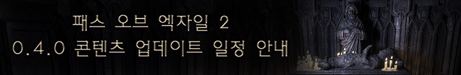 다음 확장팩의 출시 일정에 대한 계획을 말씀드릴 때가 되었습니다! 저희는 4개월 주기의 출시 일정을 그대로 유지하고 있으며, 이에 따라 패스 오브 엑자일 2의 0.4.0 업데이트를 12월 초에 출시할 예정입니다. 라이브스트리밍과 출시일은 곧 공개할 예정이니, 공지사항을 확인해 주세요. 현재 진행 중인 떠오르는 심연 리그는 몇 주 후에 종료됩니다. 리그가 종료된 이후 여러분의 캐릭터와 아이템은 스탠다드 또는 하드코어 얼리 액세스 리그로 이전됩니다. 데이터의 완전 초기화는 진행되지 않으며, 이전 작업이 완료되면 해당 리그에서 기존 캐릭터를 계속 플레이하실 수 있습니다. 저희가 준비해 온 내용을 보여드릴 날을 고대하고 있습니다. 많은 기대 부탁드립니다! |