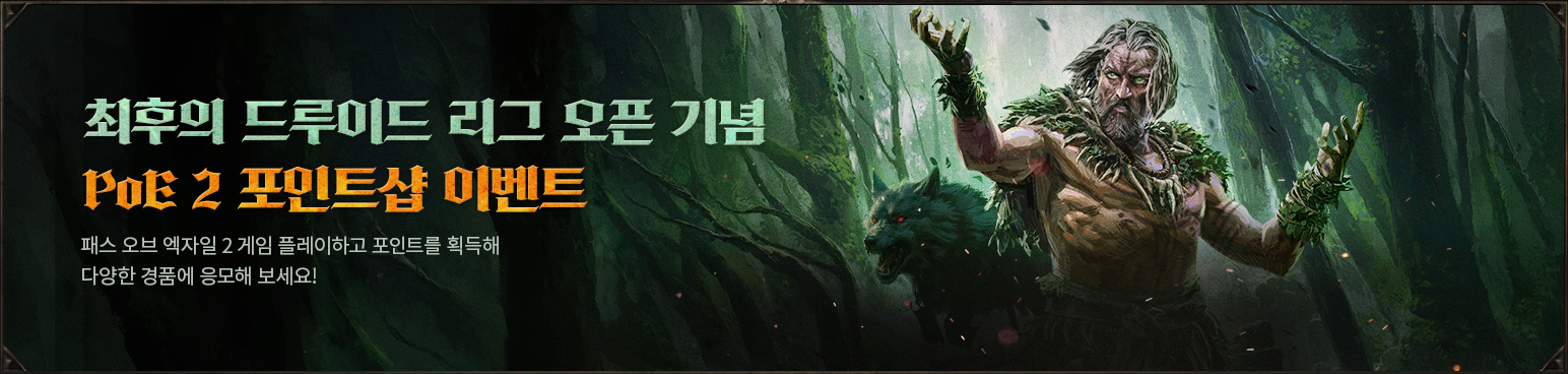 패스 오브 엑자일 2의 0.4.0 업데이트 '최후의 드루이드'의 출시를 기념하여 포인트샵 이벤트가 시작됩니다. 패스 오브 엑자일 2 얼리 액세스 서포터 팩을 구매하여 플레이 하시거나 PC방에서 패스 오브 엑자일 2를 플레이하는 방법으로 포인트를 획득하시고 이벤트에 참여하여 다양한 경품들을 획득할 수 있는 기회를 놓치지 마세요! 이벤트에 대한 자세한 내용은 아래에서 확인바랍니다. ◈ 포인트샵 이벤트 기간