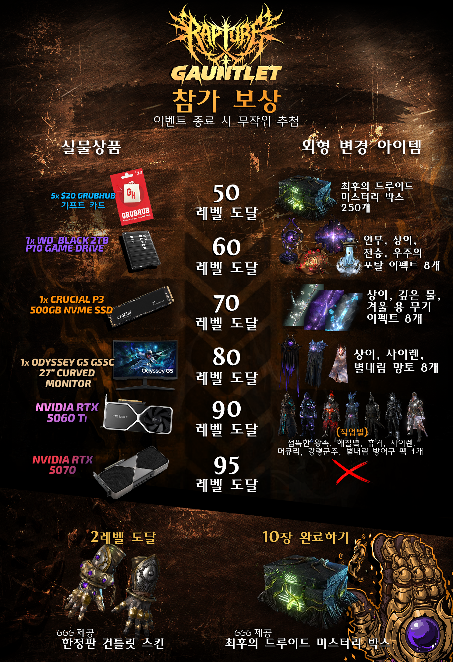 캐릭터의 레벨이 특정 구간에 도달하면, Zizaran의 이벤트 파트너 및 Grinding Gear Games가 제공하는 외형 변경 아이템 및 실물 상품의 무작위 추첨에 자동 응모됩니다!